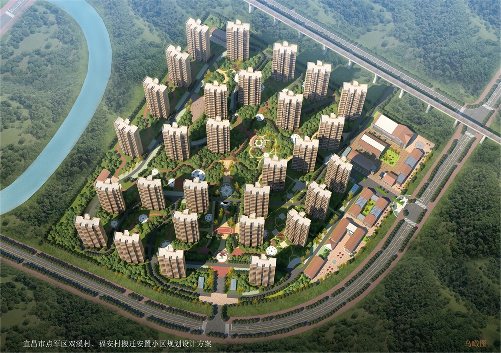 雙福家園安置房小區位于點軍區雙溪村,占地290.73畝,總建筑面積為530098.91平方米,其中住宅建筑面積為386016.14平方米,商業面積為18162.2平方米,配套公建面積為11329.44平方米,總投資約14.8億。容積率2.2,綠地率38.7%,安置戶數3584戶。共有37棟單體建筑,其中28棟32層高層住宅,配備了幼兒園、村民禮堂、菜市場、村民活動中心、商業街及配套配電室、球場等配套設施,共設停車車位2800個。