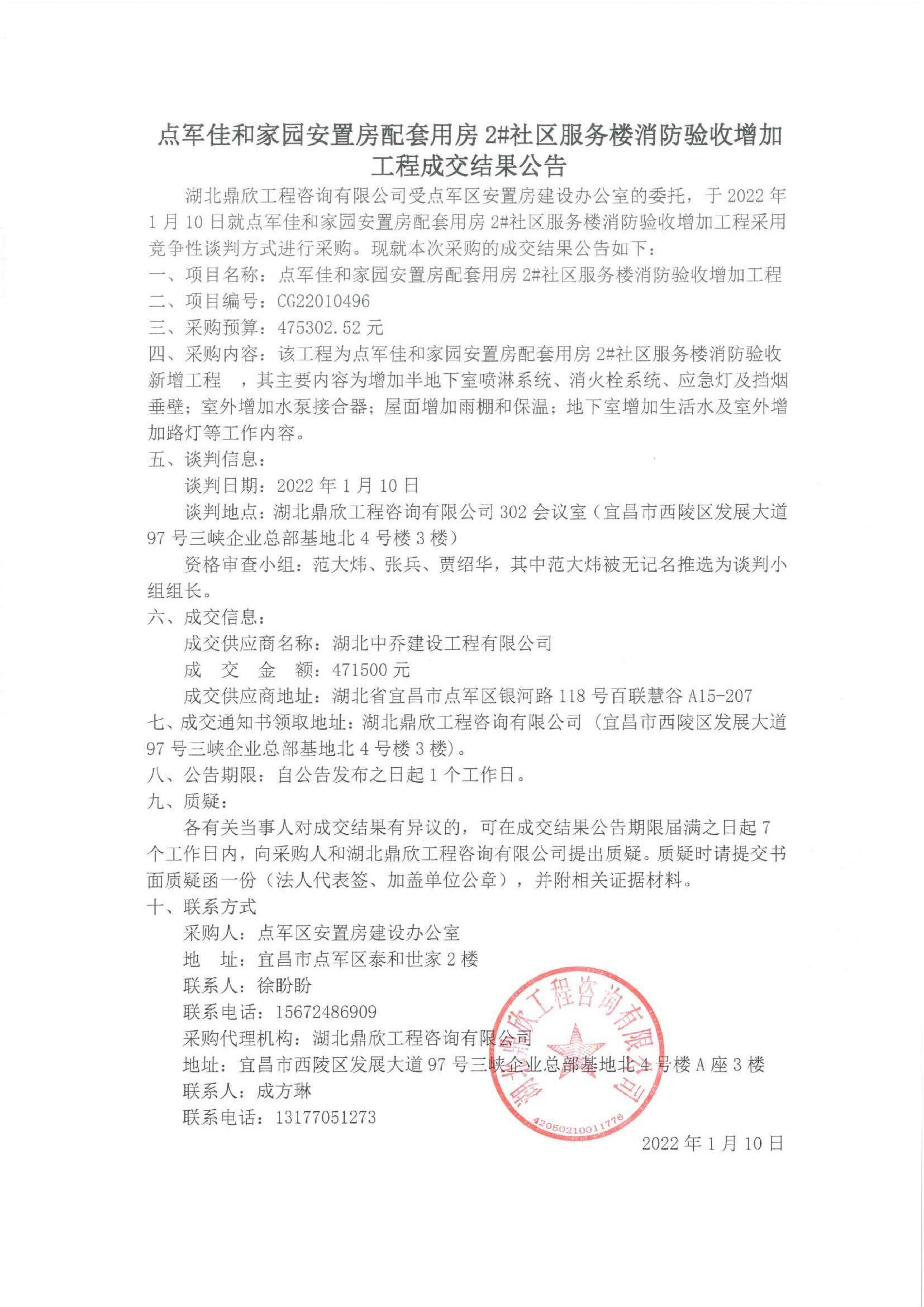 點軍佳和家園安置房配套用房2#社區服務樓消防驗收增加工程成交結果公告