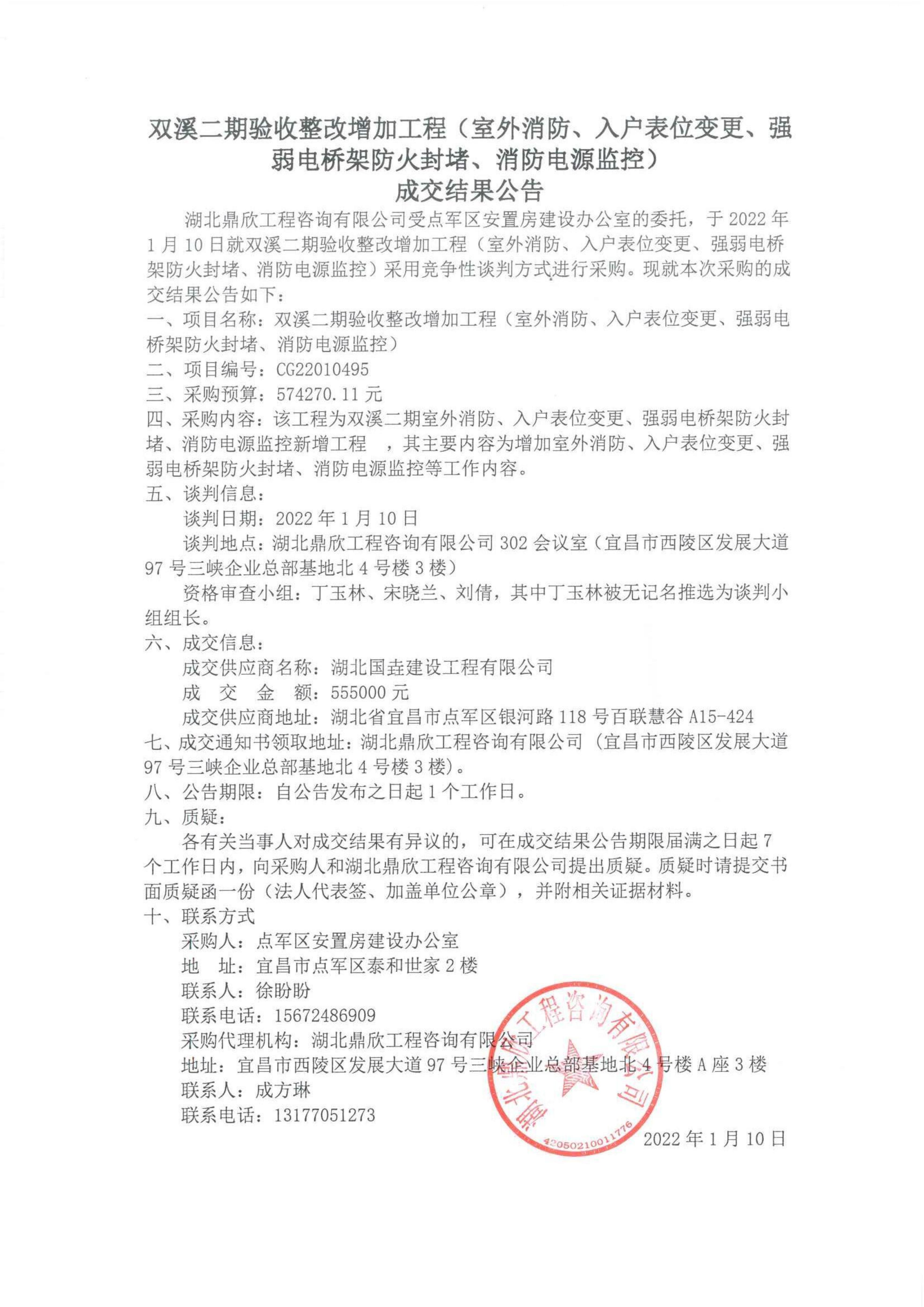 雙溪二期驗收整改增加工程(室外消防、入戶表位變更、強弱電橋架防火封堵、消防電源監控)?成交結果公告