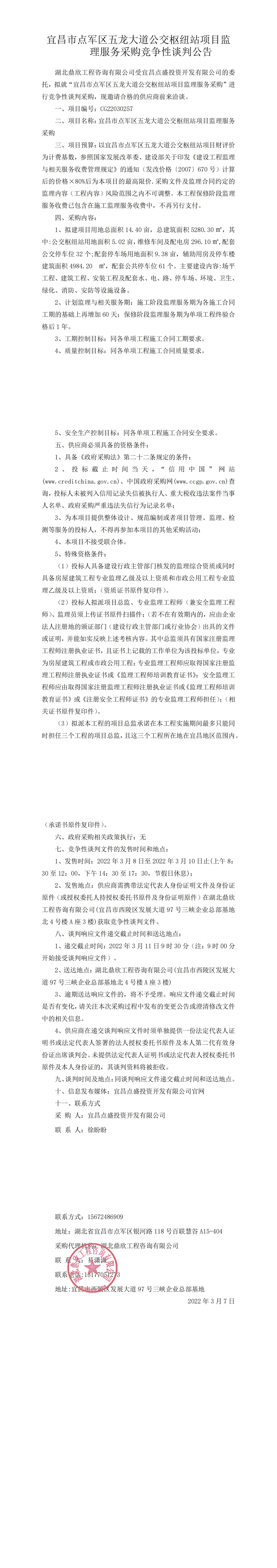 宜昌市點軍區五龍大道公交樞紐站項目監理服務采購競爭性談判公告