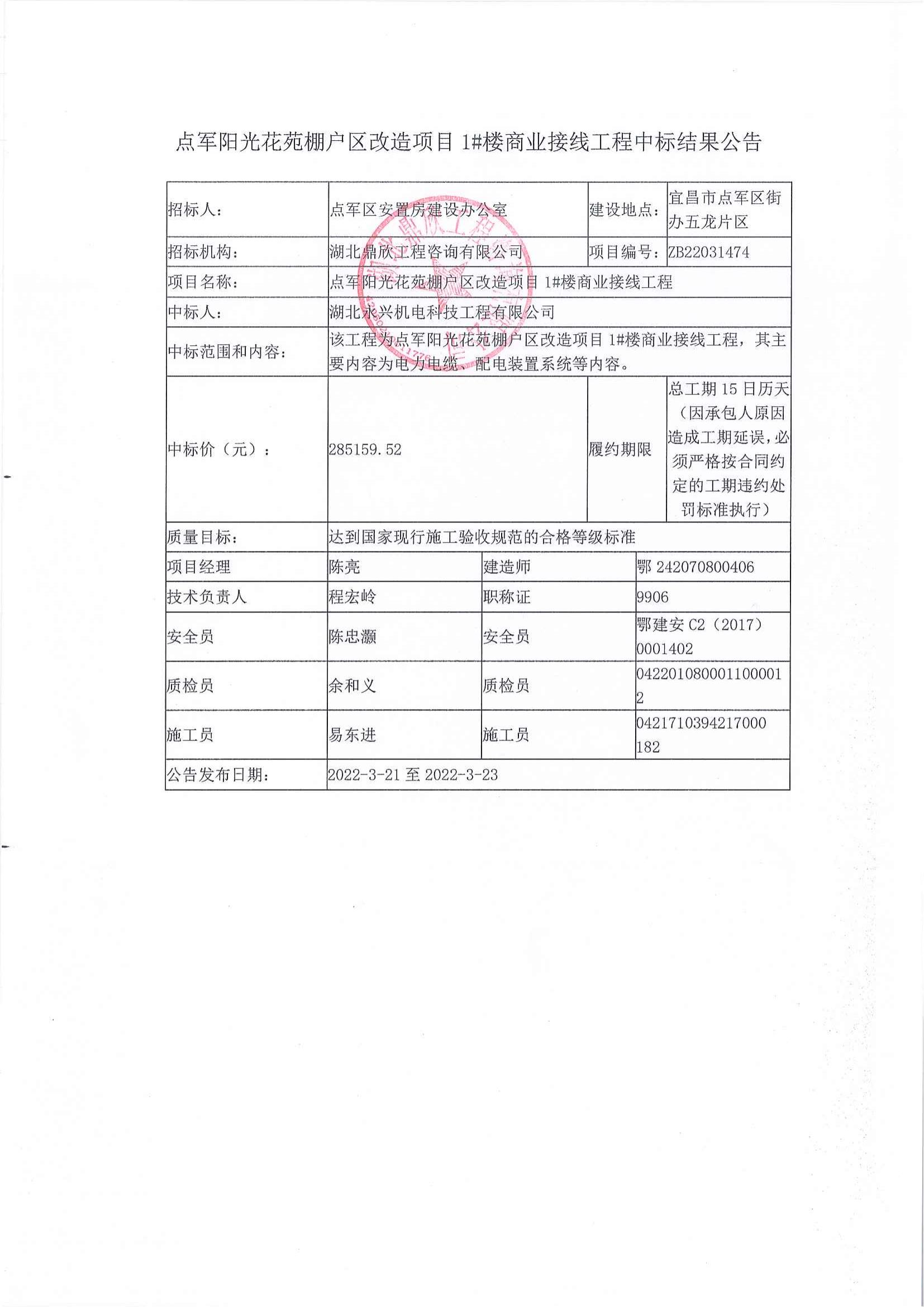 點(diǎn)軍陽(yáng)光花苑棚戶區(qū)改造項(xiàng)目1#樓商業(yè)接線工程中標(biāo)公告