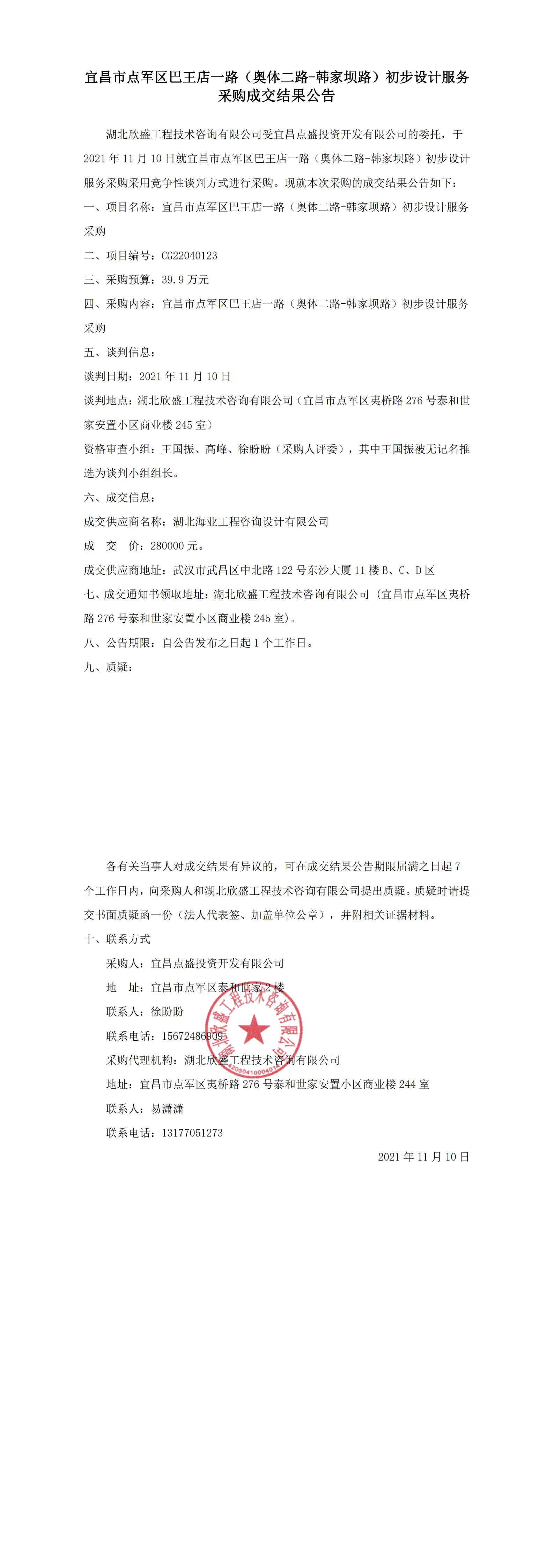 宜昌市點軍區巴王店一路(奧體二路-韓家壩路)初步設計服務采購成交結果公告