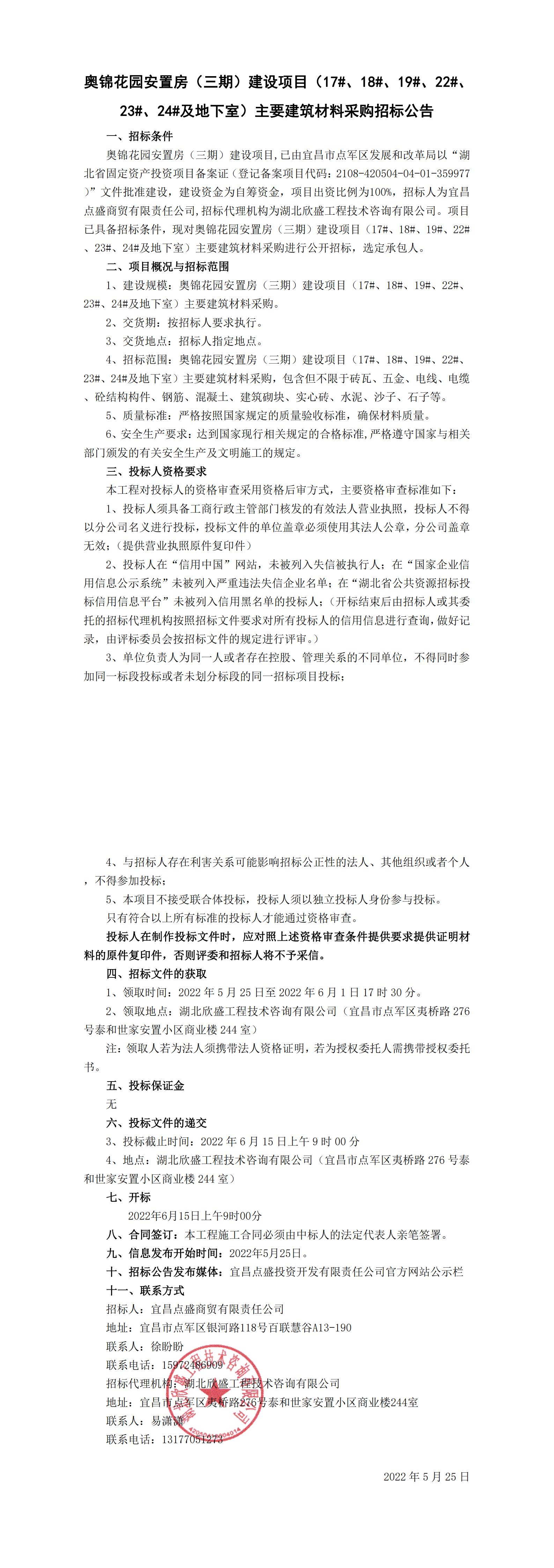 宜昌點盛商貿有限責任公司關于對奧錦花園安置房(三期)建設項目(17#、18#、19#、22#、23#、24#及地下室)主要建筑材料的采購公告