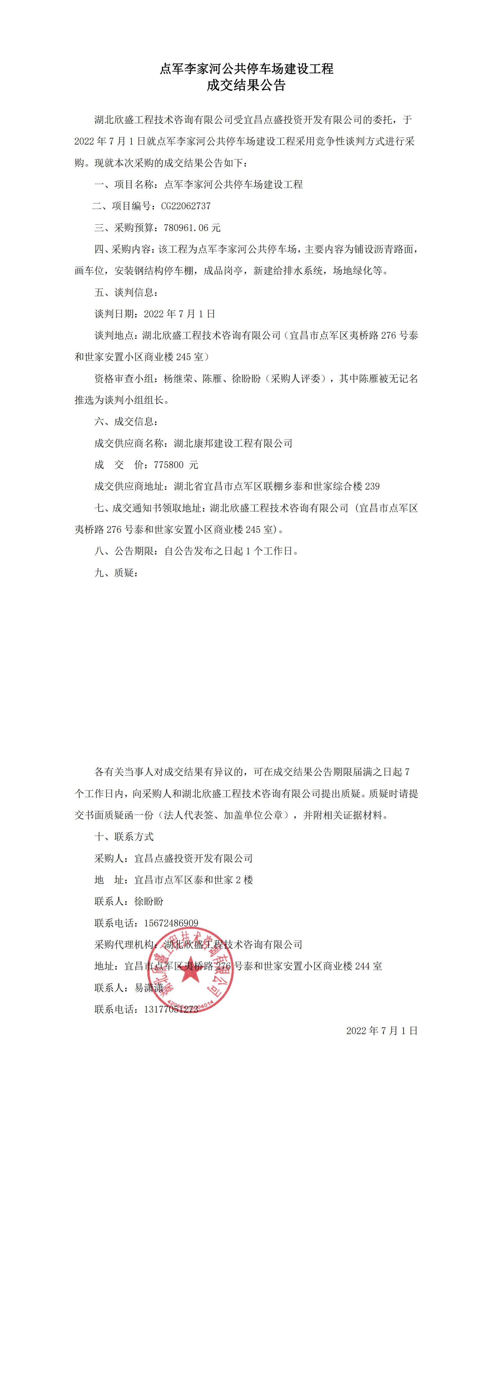 點軍李家河公共停車場建設工程成交結果公告