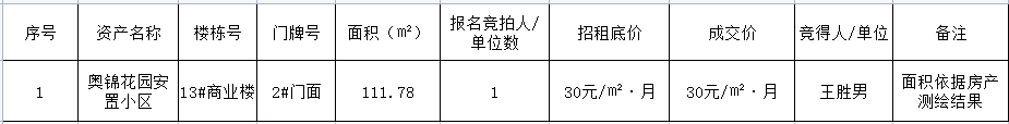 根據(jù)《點軍區(qū)出資企業(yè)資產(chǎn)租賃管理暫行辦法》及《宜昌點盛投資開發(fā)有限公司國有資產(chǎn)經(jīng)營使用實施辦法修訂版(2022.3)》,現(xiàn)對奧錦花園小區(qū)商業(yè)2#門面三年租賃權公開招租結果公告如下: