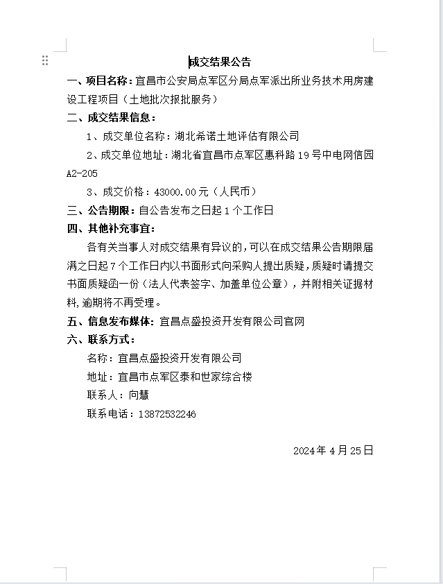 宜昌市公安局點軍區分局點軍派出所業務技術用房建設工程項目 (土地批次報批服務)成交公告