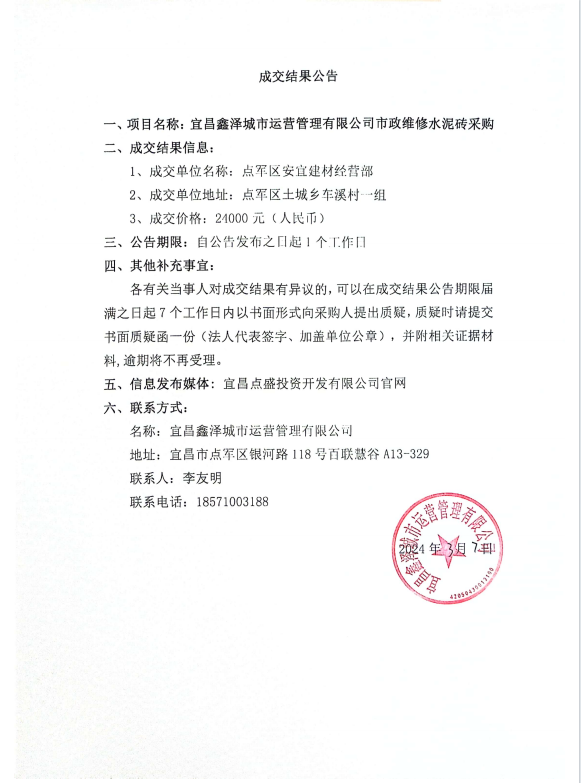 宜昌鑫澤城市運營管理有限公司市政維修水泥磚采購項目成交公告