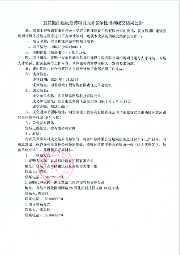 宜昌擁江建設招聘項目服務競爭性談判成交結果公告