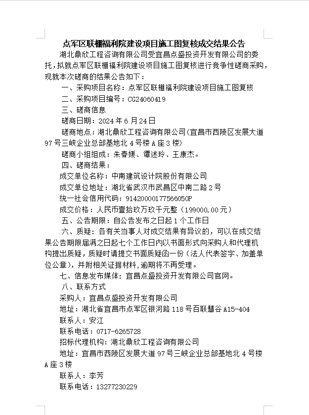 點軍區聯棚福利院建設項目施工圖復核成交結果公告