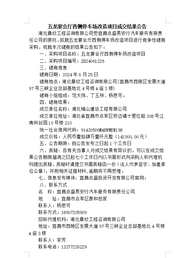五龍宴會廳西側停車場改造項目成交結果公告