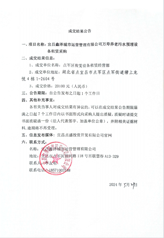 萬壽養老污水預埋設備租賃采購成交公告