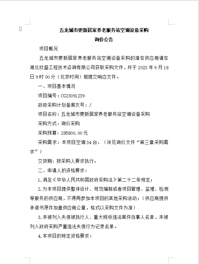 五龍城市更新居家養老服務站空調設備采購詢價公告
