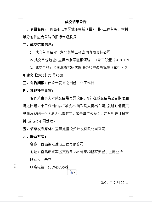 宜昌市點軍區城市更新項目(一期)工程勞務、材料等分包供應商采購的招標代理服務成交結果公告