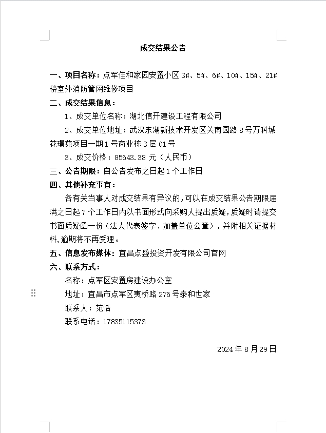 點軍佳和家園安置小區3#、5#、6#、10#、15#、21#樓室外消防管網維修項目成交公告
