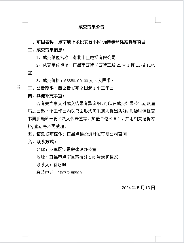 點軍塘上龍悅安置小區3#樓鋼絲繩維修等項目成交公告