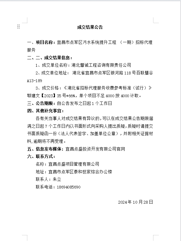 宜昌市點軍區污水系統提升工程 (一期)招標代理服務成交公告