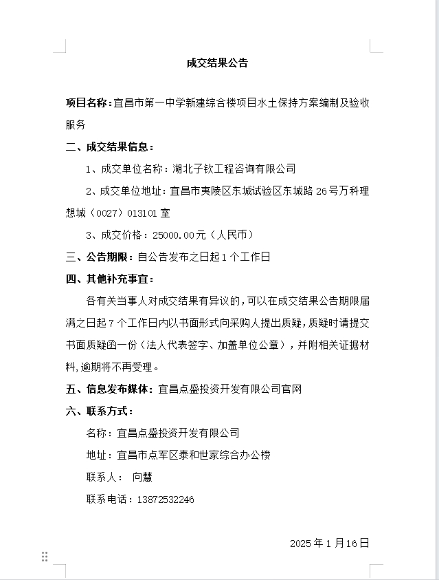 宜昌市第一中學新建綜合樓項目水土保持方案編制及驗收服務成交公告