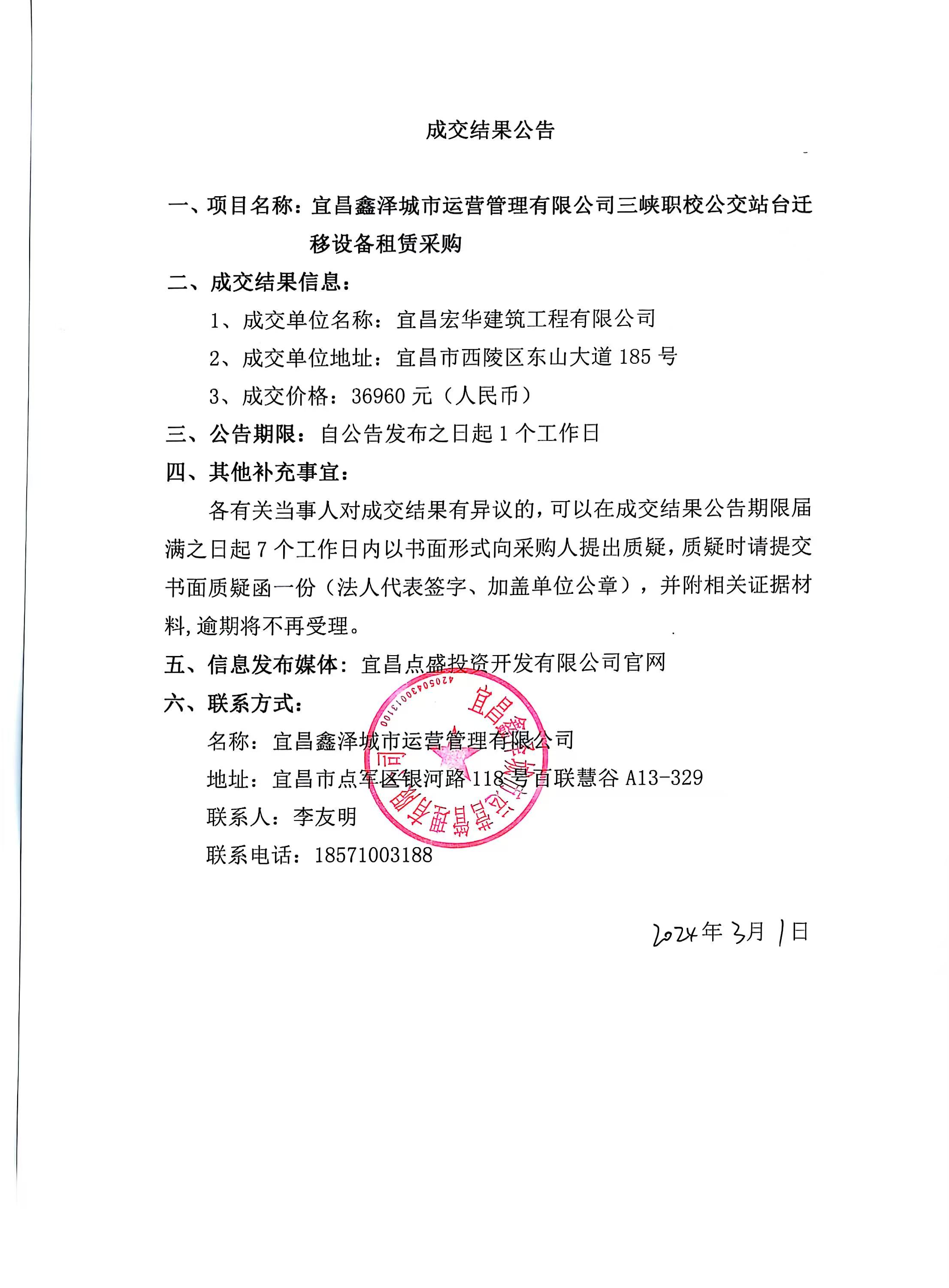 三峽職校公交站臺遷移項目設備租賃采購成交公告