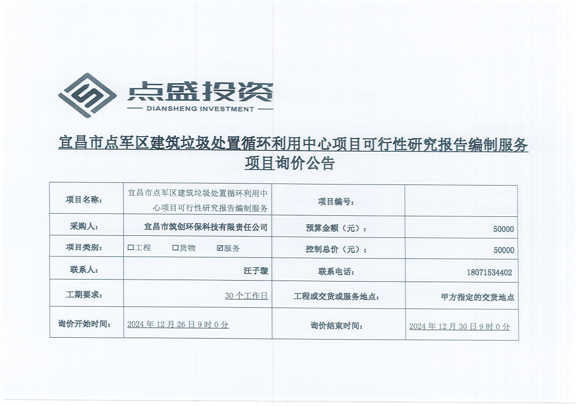 宜昌市點軍區建筑垃圾處置循環利用中心項目可行性研究報告編制服務項目詢價公告