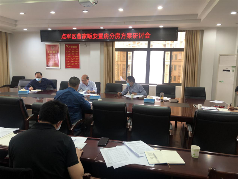 2020年4月30日,區委書記宋濤、區委副書記區長高杰、區人大常委會主任王懷炳、區城建公司副總經理陳啟國、區住房保障中心副主任魏京偉、區土城鄉鄉長王小平等人研討點軍區曹家畈安置房選房方案。